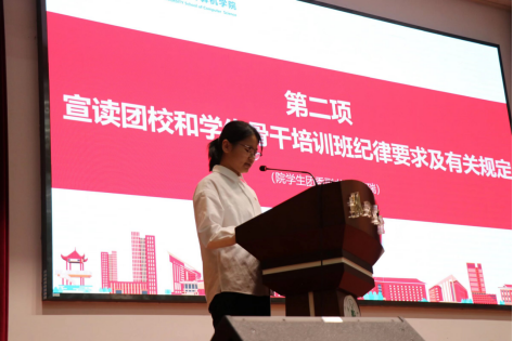学院团委学生副书记谈瑞宣读团校和学生骨干培训纪律要求及相关规定。她提醒学员们要遵守团课纪律,深刻领悟骨干培训的目的与意义,强调学员们要始终保持积极主动的学习态度,以严谨的作风投入到培训学习中。